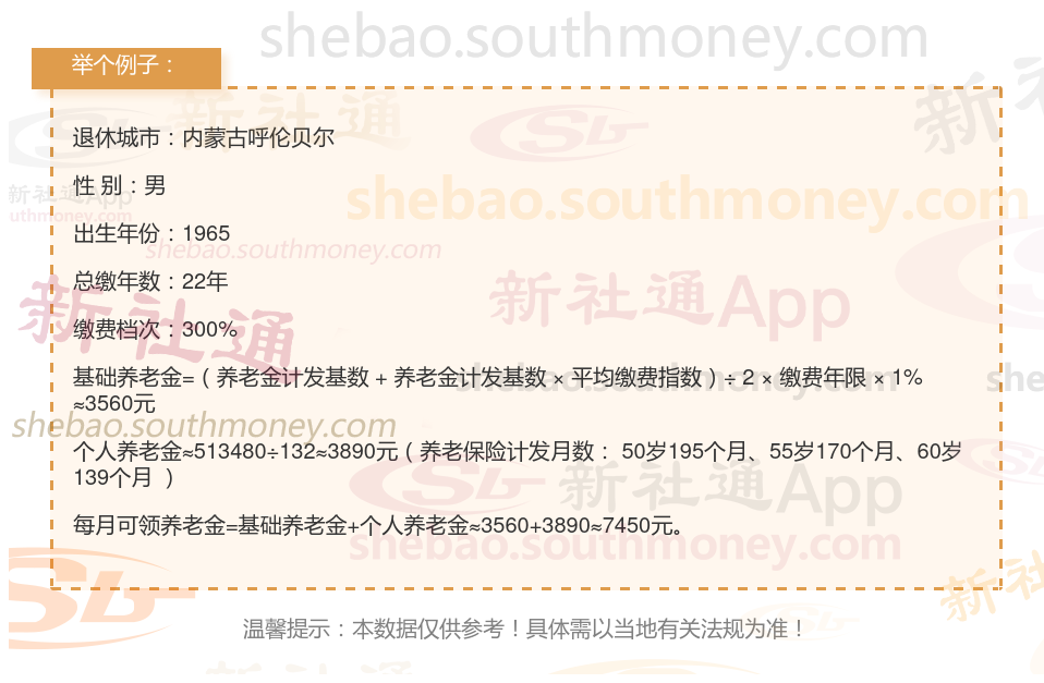 张某,内蒙古呼伦贝尔人,1965年出生,是一名拥有22载社保缴费年限的退休男性,缴费档次稳定在300%。岁月流转,他终于迎来了自己的退休时光。借助新社通app养老金在线计算器计算所得: