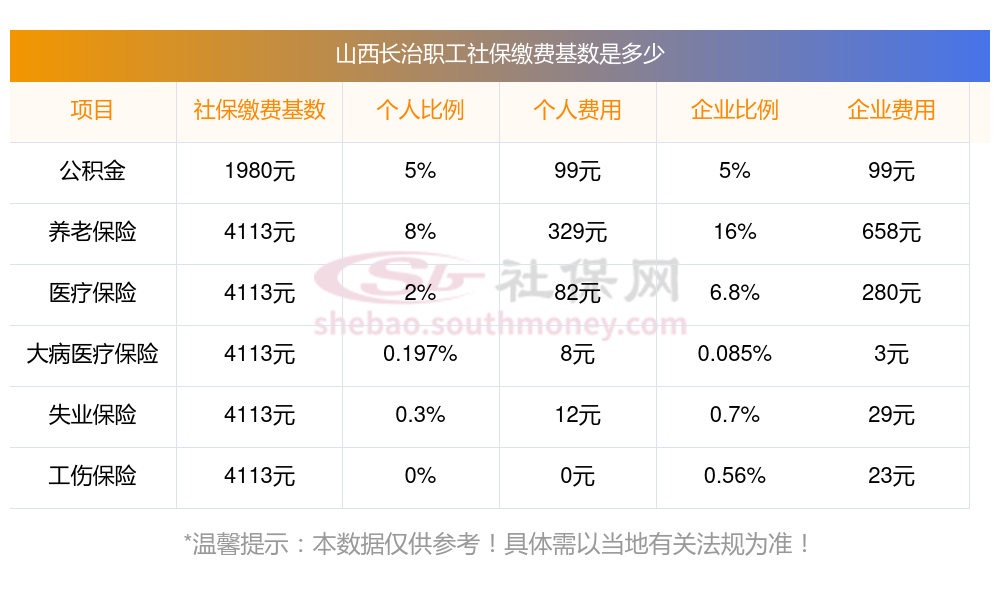 山西长治缴费社保比例一览 社保公司和个人各交多少?下表是2024-2025年山西长治社保费用明细参考,新社通app-社保缴费查询工具提供的最新数据如下: