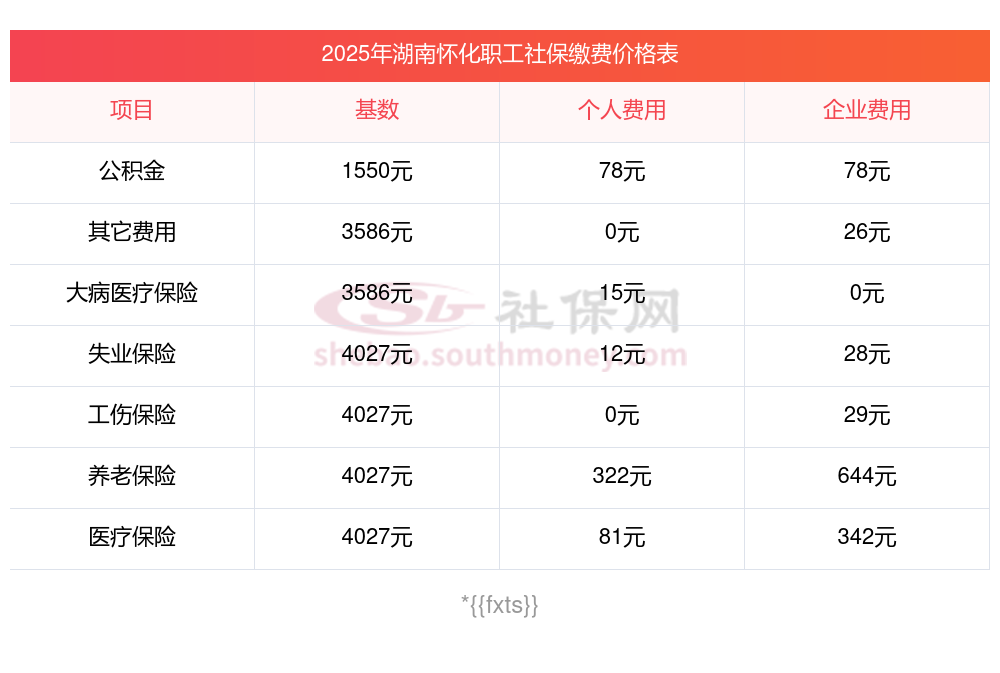 2025年湖南怀化五险缴费标准是多少,2025年湖南怀化社保缴费多少钱?下表是2025年湖南怀化社保费用明细参考,新社通app-社保缴费查询工具提供的最新数据如下: