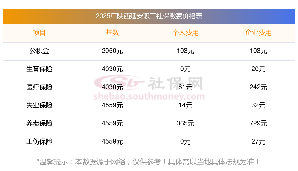 2025年陕西延安社保缴费最低基数及个人和单位具体是多少钱?下表是2025年陕西延安社保费用明细参考,新社通app-社保缴费查询工具提供的最新数据如下: