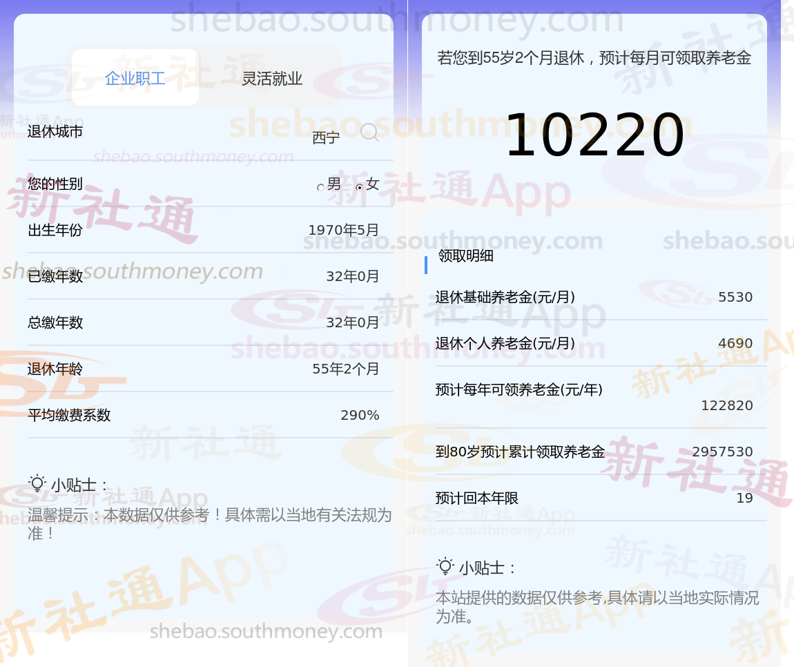 张某,1970年出生于青海西宁,是一位拥有32年社保缴费记录的退休职工,缴费档次为290%。辛勤工作多年后,她迎来了退休生活。通过新社通app养老金计算器计算所得,张某得知自己每月可以领取到基础养老金约5530元,加上个人养老金约4690元,总计10220元。虽然金额不算多,但对于张某来说,这是一份稳定的收入来源,为她的退休生活增添了一份安心与保证。