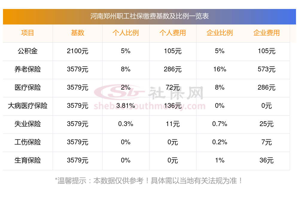 河南郑州五险一金交多少钱一个月?下表是2024-2025年河南郑州社保费用明细参考,新社通app-社保缴费查询工具提供的最新数据如下: