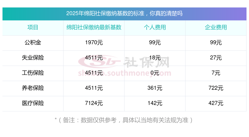 2025年绵阳5险缴费标准,2025年绵阳社保缴费多少钱?下表是2025年绵阳社保费用明细参考,新社通app-社保缴费查询工具提供的最新数据如下: