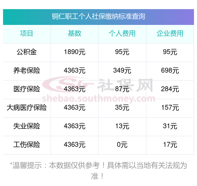 2025年铜仁社保缴费最低基数及个人和单位具体是多少钱?下表是2025年铜仁社保费用明细参考,新社通app-社保缴费查询工具提供的最新数据如下: