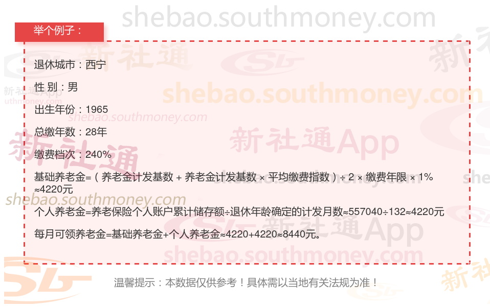 这是一位1965年出生的男性退休职工的个人档案,他来自西宁,已缴纳社保28年,且缴费档次为240%。通过新社通app养老金计算器得出: