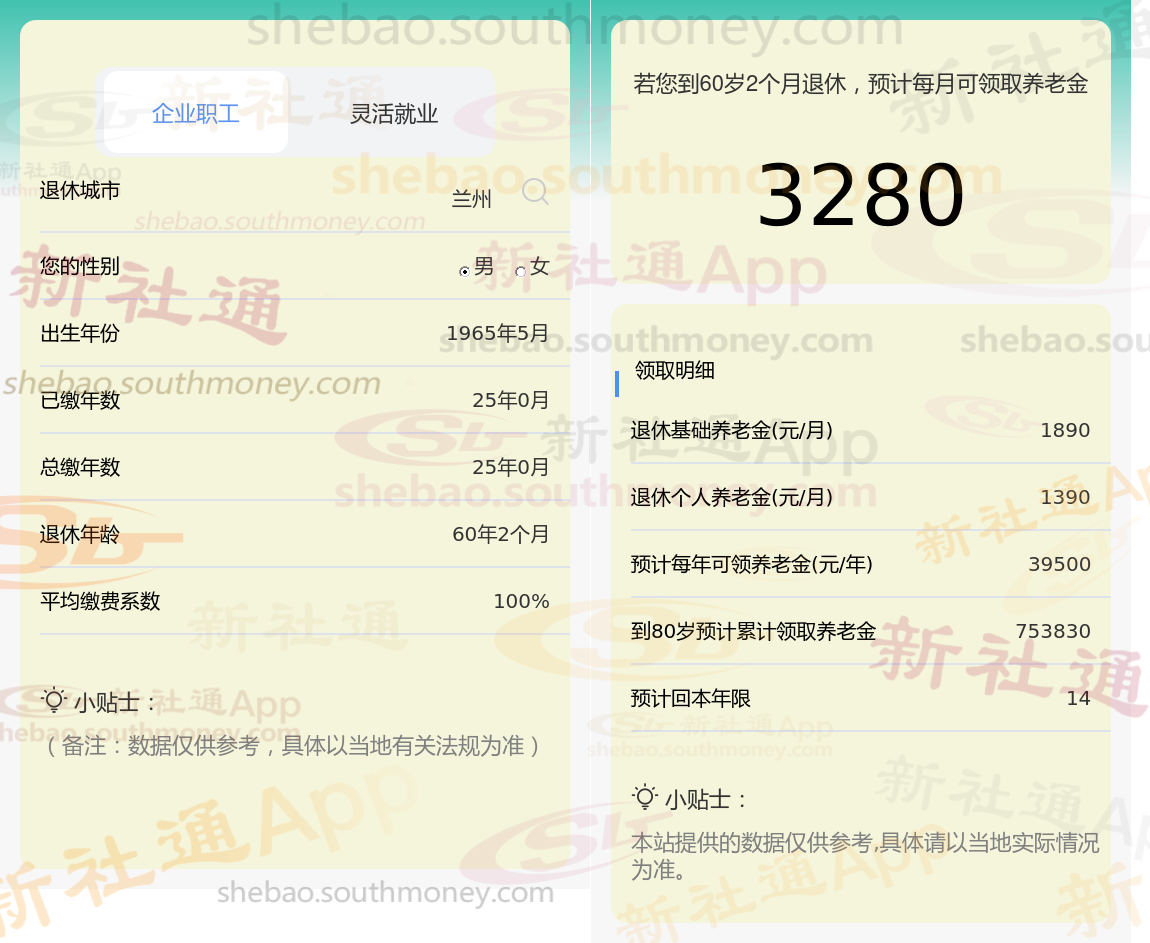 个人基础信息:男性,1965年出生,兰州退休人士,拥有25年的缴费年限,缴费档次为100%。