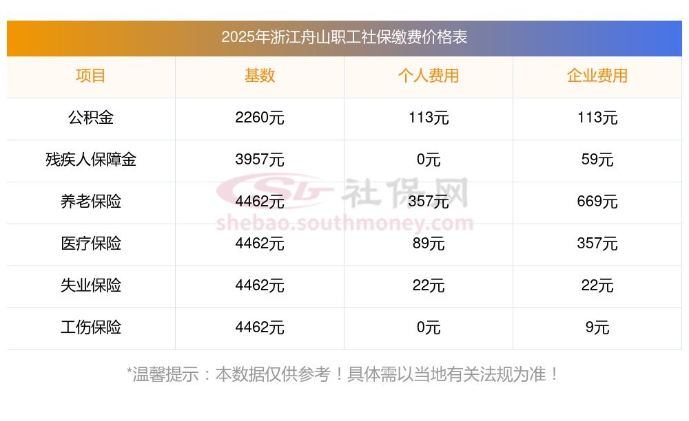 2025年浙江舟山社保缴费最低基数及个人和单位具体是多少钱?下表是2025年浙江舟山社保费用明细参考,新社通app-社保缴费查询工具提供的最新数据如下: