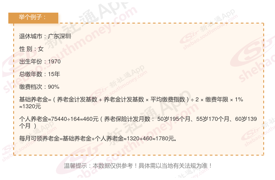 王某,广东深圳人,1970年出生,是一名拥有15载社保缴费年限的退休女性,缴费档次稳定在90%。岁月流转,她终于迎来了自己的退休时光。借助新社通app养老金在线计算器计算所得:
