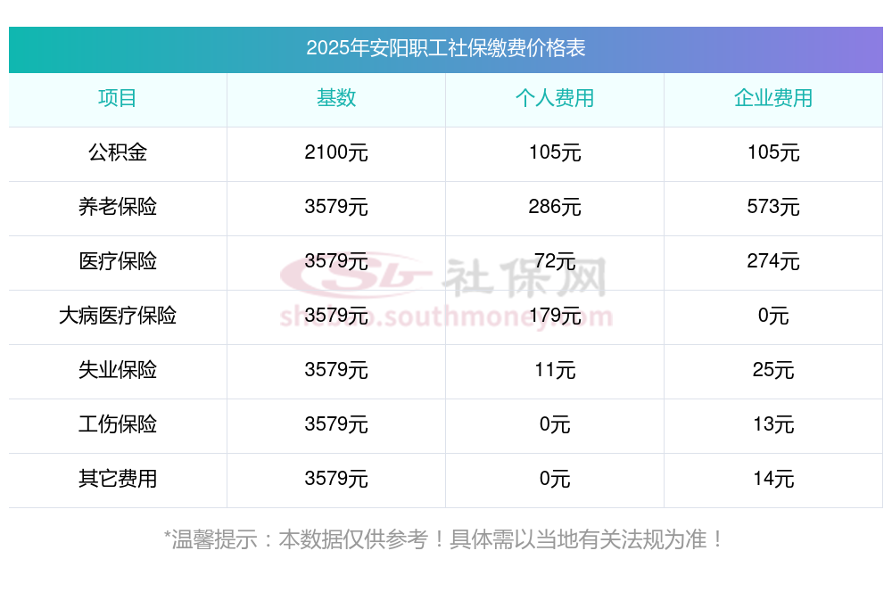 2025年安阳五险缴费标准是多少,2025年安阳社保缴费多少钱?下表是2025年安阳社保费用明细参考,新社通app-社保缴费查询工具提供的最新数据如下: