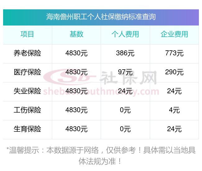 社保缴纳比例一览,社保公司和个人各交多少?下表是2023-2024年海南儋州社保费用明细参考,新社通app-社保缴费查询工具提供的最新数据如下: