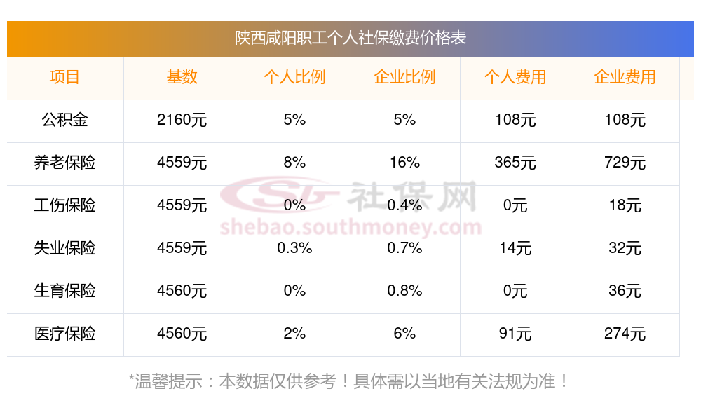 2025年陕西咸阳社保缴费多少钱?下表是2023-2024年陕西咸阳社保费用明细参考,新社通app-社保缴费查询工具提供的最新数据如下: