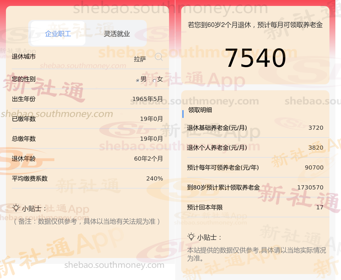 个人基础信息:男性,1965年出生,西藏拉萨退休人士,拥有19年的缴费年限,缴费档次为240%。