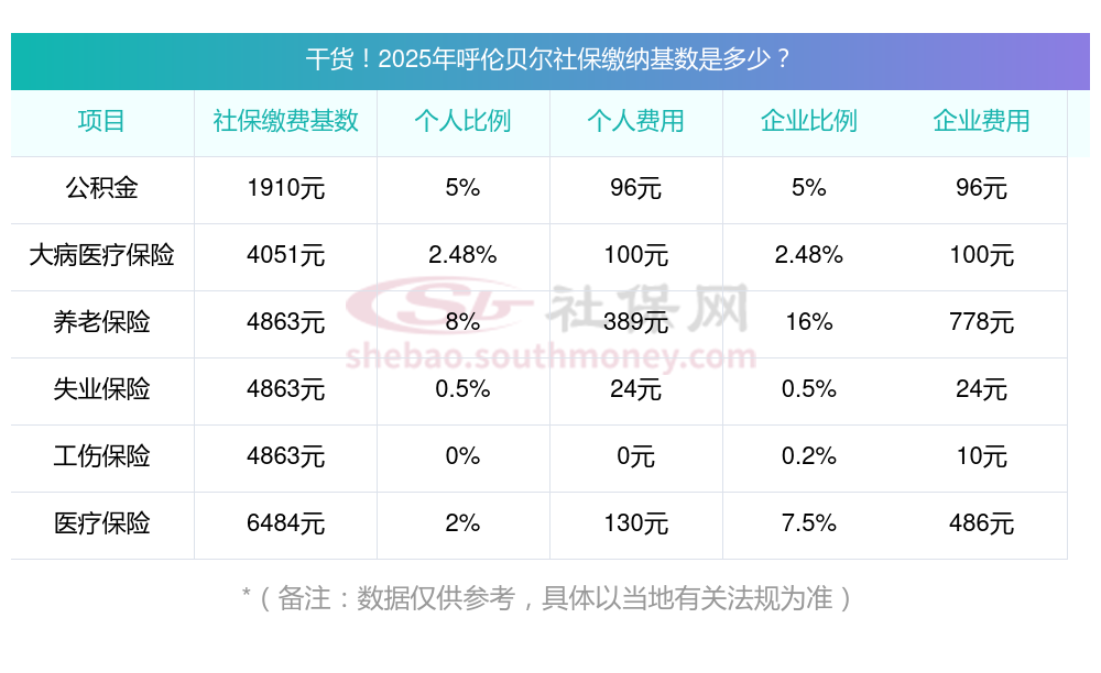 2025年呼伦贝尔社保缴费最低基数及个人和单位具体是多少钱?下表是2025年呼伦贝尔社保费用明细参考,新社通app-社保缴费查询工具提供的最新数据如下: