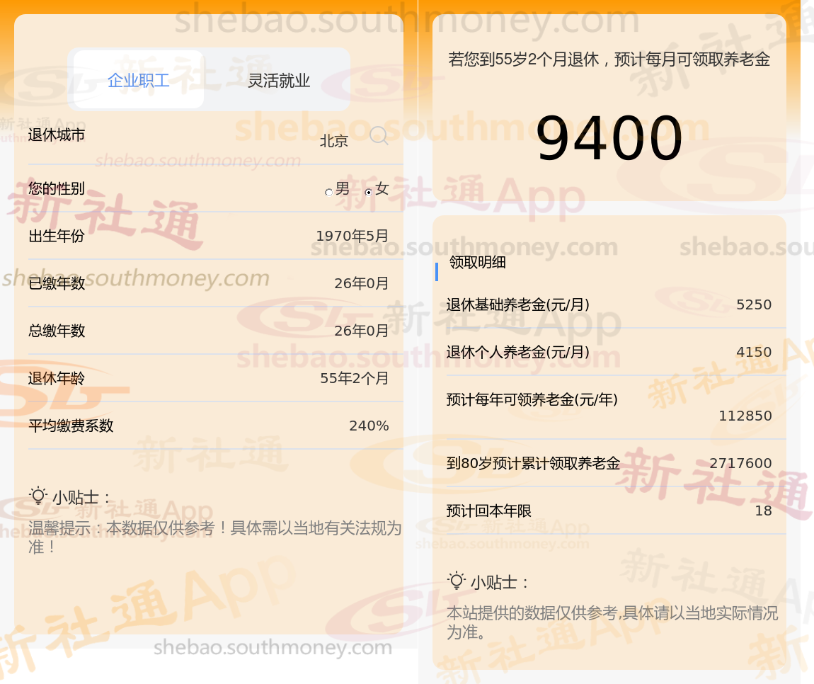 希某,北京人,1970年出生,是一名拥有26载社保缴费年限的退休女性,缴费档次稳定在240%。岁月流转,她终于迎来了自己的退休时光。借助新社通app养老金在线计算器计算所得: