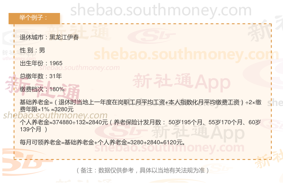 退休城市:黑龙江伊春,性别:男,出生年份:1965,总缴年数31年,缴费档次:180%,新社通app养老金计算器所得: