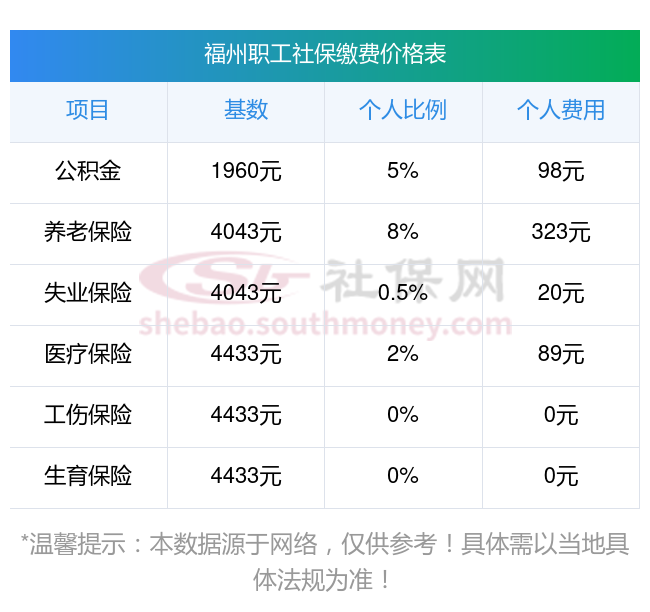 2025年福州社保缴纳比例,2025年福州社保缴费多少钱?下表是2024-2025年福州社保费用明细参考,新社通app-社保缴费查询工具提供的最新数据如下: