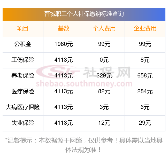 晋城缴费社保比例一览社保公司和个人各交多少?下表是2024-2025年晋城社保费用明细参考,新社通app-社保缴费查询工具提供的最新数据如下: