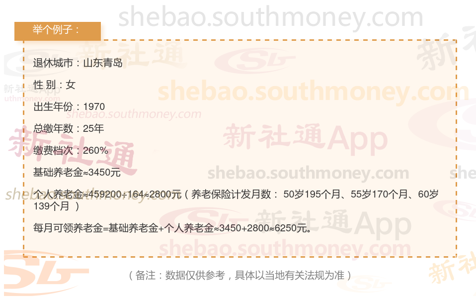 一名山东青岛女性退休人员的概况:她出生于1970年,作为职工已缴纳社保满25年,且缴费档次达到260%。