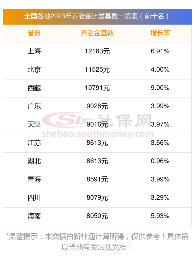 据了解,全国各省均呈上涨趋势。以下是2023年全国31省的养老金计发基数前十名