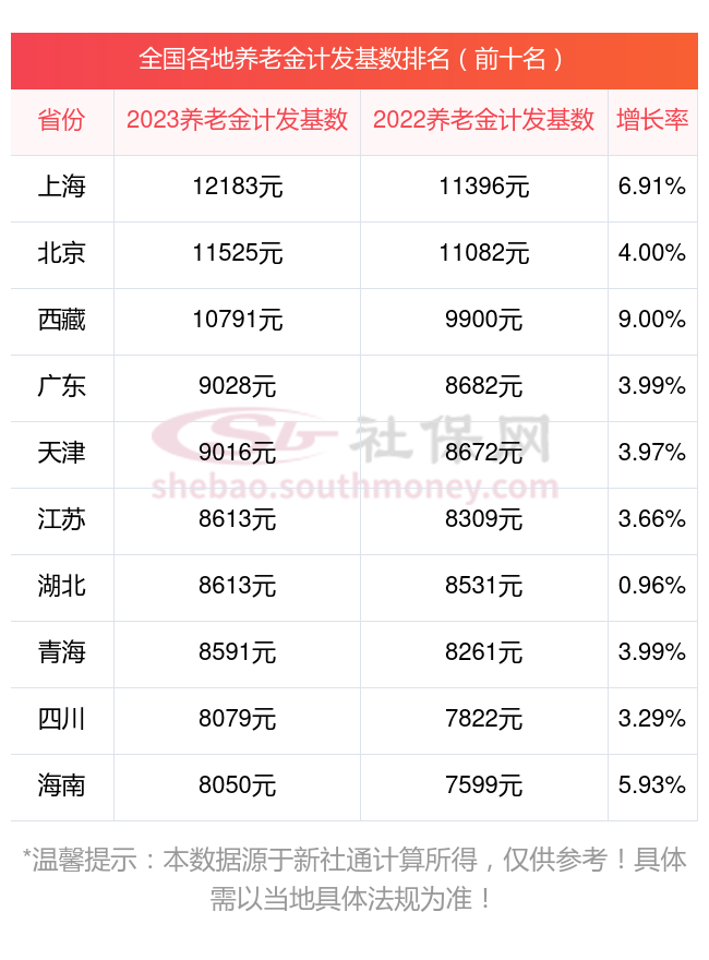 据了解,全国各省均呈上涨趋势。以下是2023年全国31省的养老金计发基数前十名