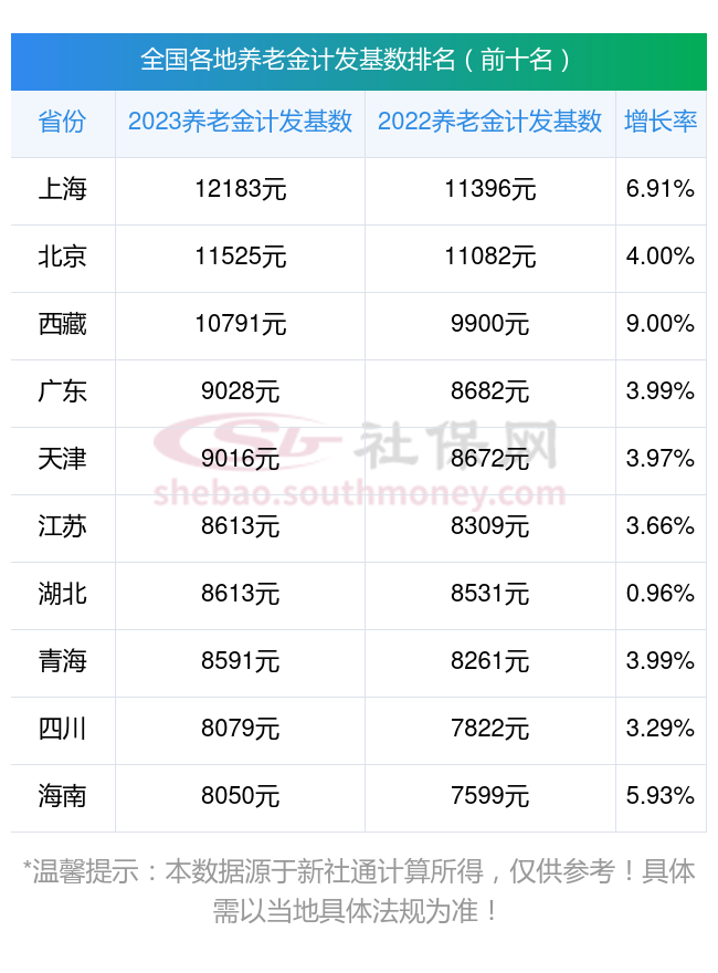 据了解,全国各省均呈上涨趋势。以下是2023年全国31省的养老金计发基数前十名