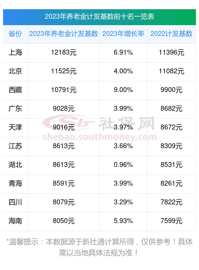 上海位列第一,养老金计发基数达到12183.00元,增长率为6.91%;