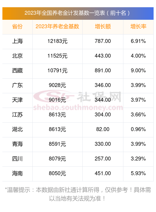 首先来看看,2023年全国养老金计发基数的前十省份一览表
