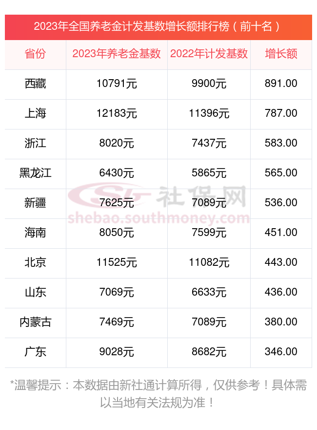 很多朋友好奇哪些省份的养老金计发基数涨幅较大?社保网小编整理了2023年养老金计发基数增长额排行榜前十名,分享如下