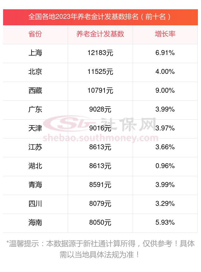 下面来看看全国各地2023年养老金计发基数增长率排名(前十名)