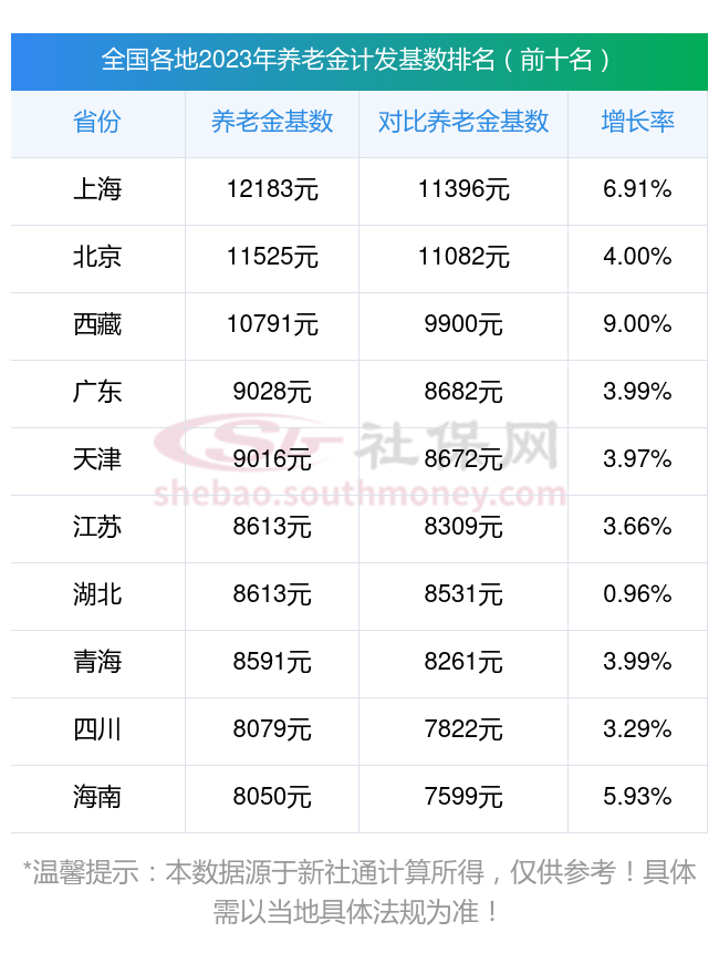 上海位列第一,养老金计发基数达到12183.00元,增长率为6.91%;
