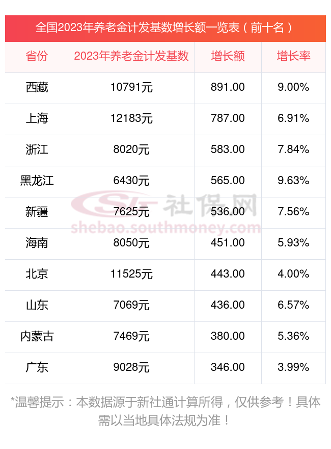 很多朋友好奇哪些省份的养老金计发基数涨幅较大?社保网小编整理了2023年养老金计发基数增长额排行榜前十名,分享如下