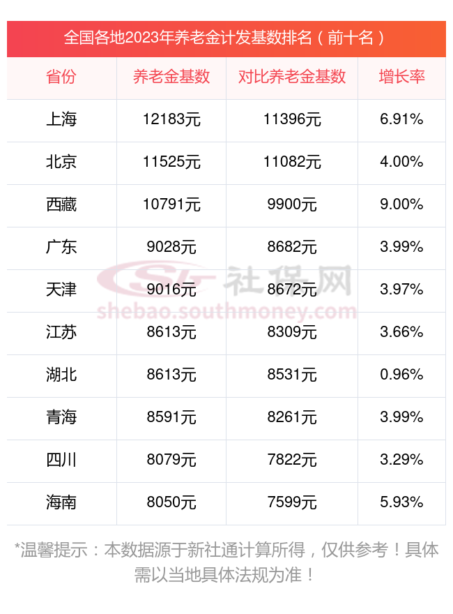 据了解,全国各省均呈上涨趋势。以下是2023年全国31省的养老金计发基数前十名