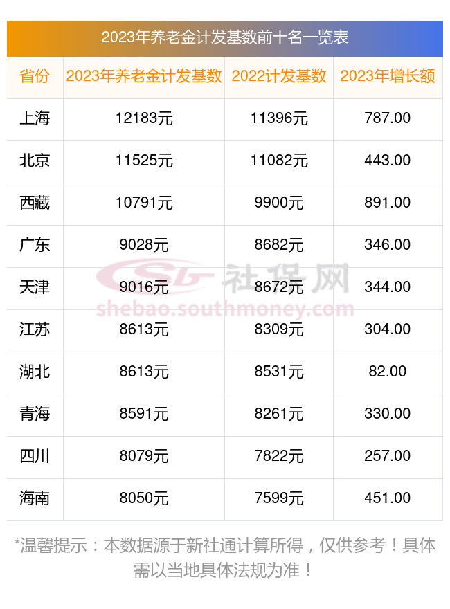 上海位列第一位,养老金计发基数达到12183.00元,增长率为6.91%;
