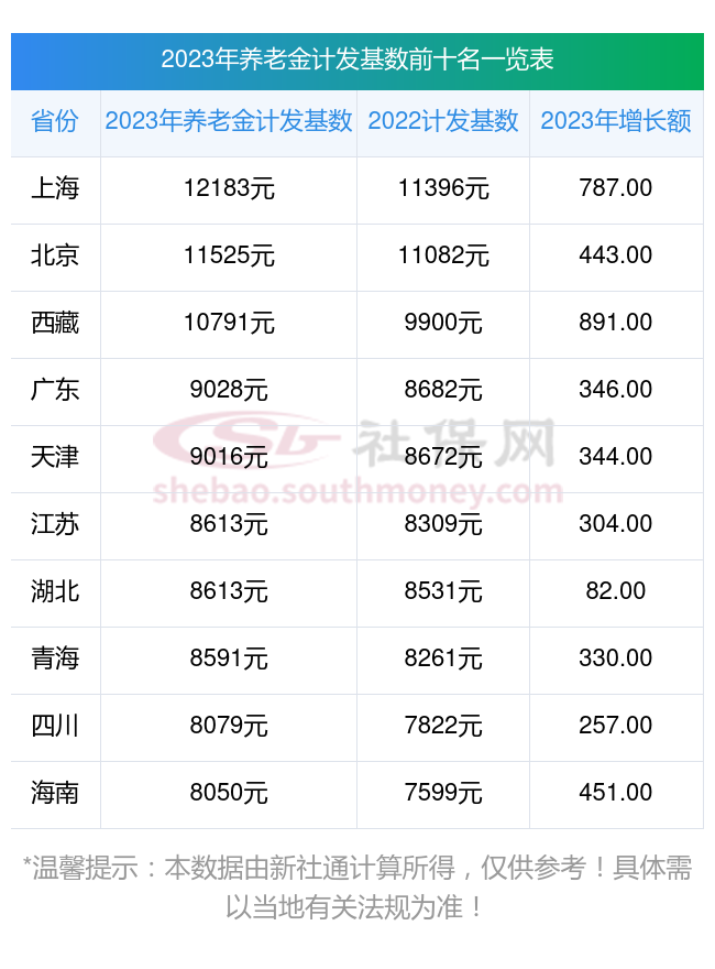 下面来看看全国各地2023年养老金计发基数一览表(前十名)