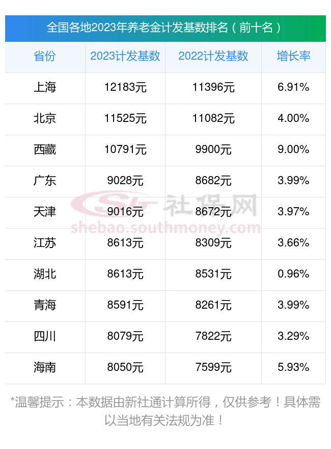 上海位列第一,养老金计发基数达到12183.00元,增长率为6.91%;