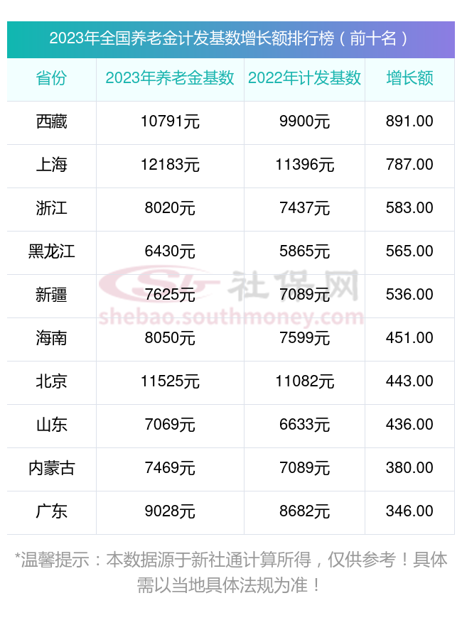 很多朋友好奇哪些省份的养老金计发基数涨幅较大?社保网小编整理了2023年养老金计发基数增长额排行榜前十名,分享如下