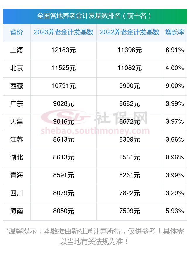 下面来看看全国各地2023年养老金计发基数一览表(前十名)