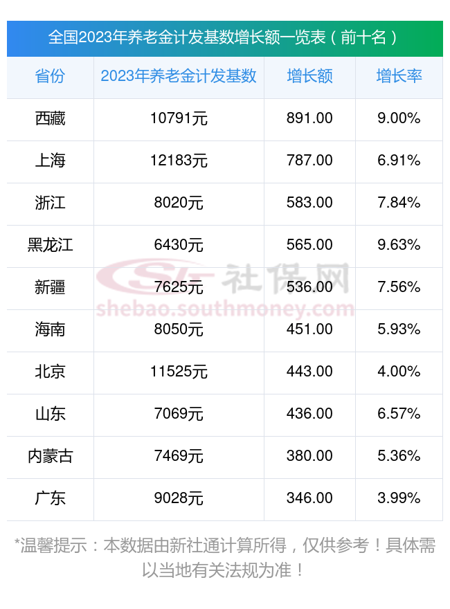 很多朋友好奇哪些省份的养老金计发基数涨幅较大?社保网小编整理了2023年养老金计发基数增长额排行榜前十名,分享如下