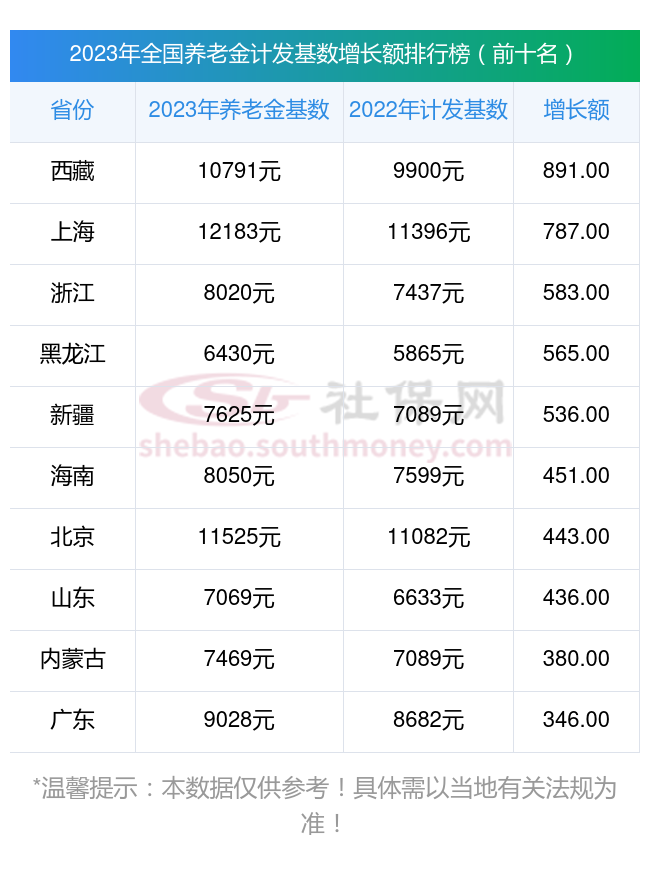 很多朋友好奇哪些省份的养老金计发基数涨幅较大?社保网小编整理了2023年养老金计发基数增长额排行榜前十名,分享如下
