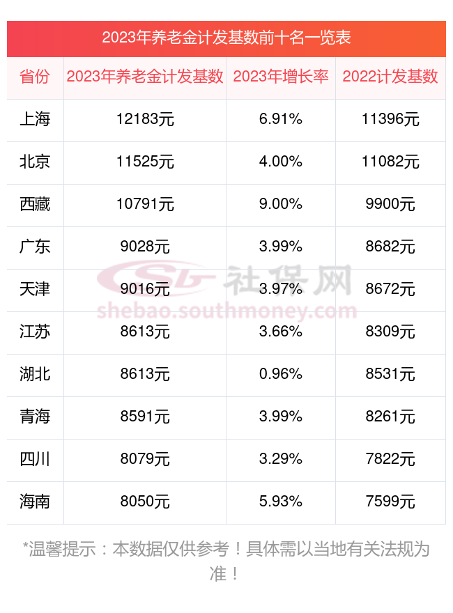 据新社通app显示,2023年上海位列第一位,养老金计发基数达到12183.00元,增长率为6.91%;北京排名第二,养老金计发基数为11525.00元,增长率为4.00%;西藏排名第三,养老金计发基数11010.00元,增长率为1.99%。排名前10的还有:广东、天津、湖北、江苏、青海、四川、海南。