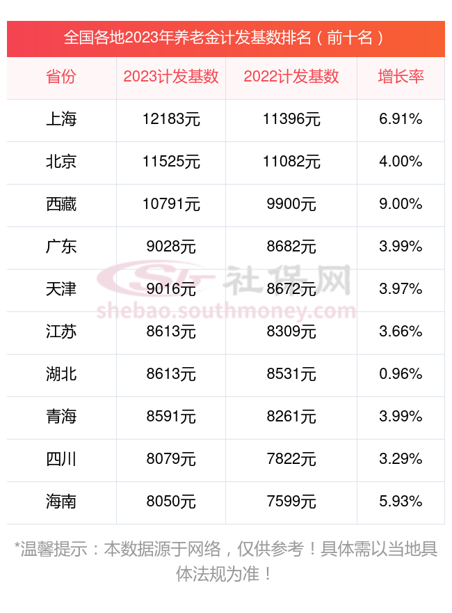 据新社通app显示,下面来看看全国各地2023年养老金计发基数一览表(前十名)