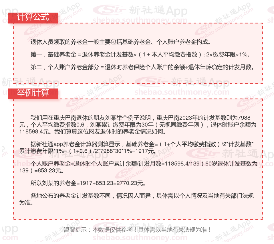 为了更加精确地了解自己未来每月能够领取的养老金金额,我们需要深入了解并掌握养老金的计算方法通过了解养老金的计算方式和影响因素,我们可以更好地规划自己的退休生活,确保生活质量不会因为退休而大幅下降。那么,社保交满15年后退休,每月能领取多少钱的养老金?下面随新社通app小编一起来看看重庆巴南2024年养老金计算公式。