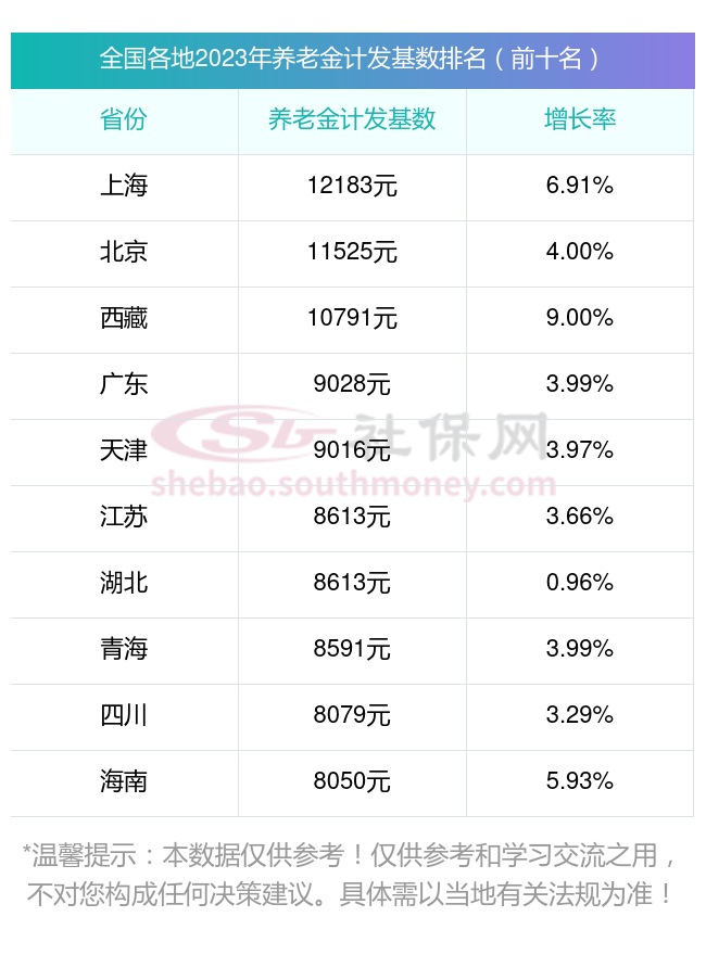 据新社通app显示,2023年上海位列第一位,养老金计发基数达到12183.00元,增长率为6.91%;北京排名第二,养老金计发基数为11525.00元,增长率为4.00%;西藏排名第三,养老金计发基数11010.00元,增长率为1.99%。排名前10的还有:广东、天津、湖北、江苏、青海、四川、海南。