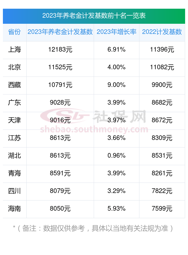据新社通app显示,2023年上海位列第一位,养老金计发基数达到12183.00元;北京排名第二,养老金计发基数为11525.00元;西藏排名第三,养老金计发基数11010.00元。排名前10的还有:广东、天津、湖北、江苏、青海、四川、海南。