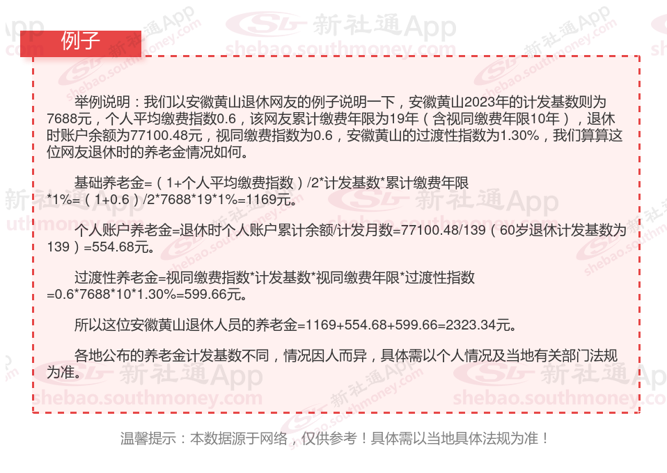 据新社通app显示,安徽黄山2023年职工养老金计发基数终于迎来公布——2023年安徽黄山企业职工养老金计发基数为7688元。比上一年增加287元,增长3.88%。