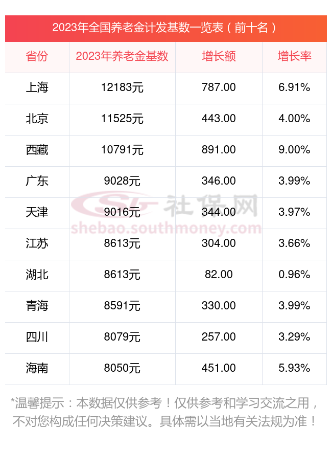 上海位列第一,养老金计发基数达到12183.00元,增长率为6.91%;