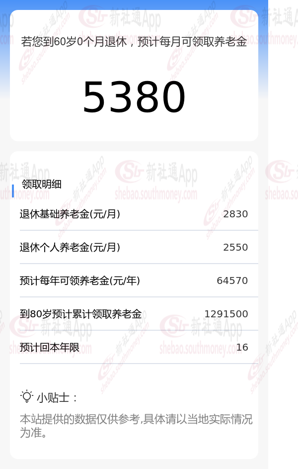 每月可领养老金=基础养老金+个人养老金≈2830+2550≈5380元。