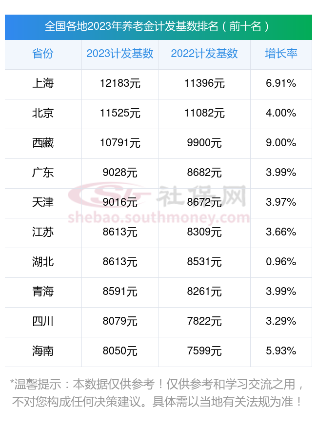 据新社通app显示,2023年上海位列第一位,养老金计发基数达到12183.00元,增长率为6.91%;北京排名第二,养老金计发基数为11525.00元,增长率为4.00%;西藏排名第三,养老金计发基数11010.00元,增长率为1.99%。排名前10的还有:广东、天津、湖北、江苏、青海、四川、海南。