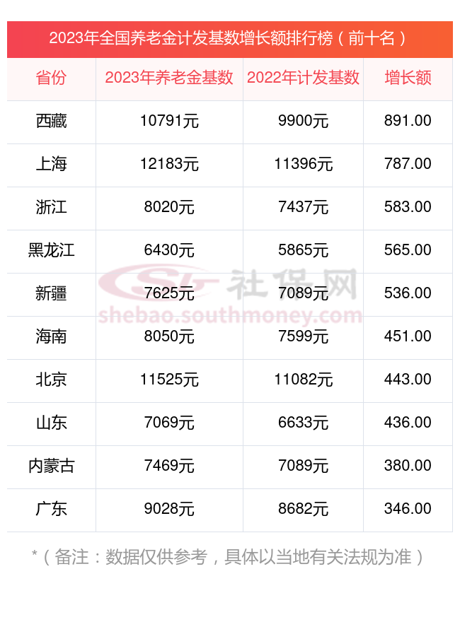 2023年最新养老金计发基数增长额排行榜前几位的情况如何呢?