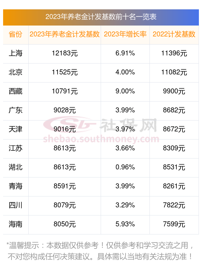 下面看看2023-2024年全国各地养老金计发基数排名前十